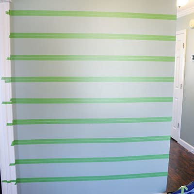 ▼用彩色膠帶裝飾牆壁,膠帶倆倆貼在牆上,在中間縫隙處畫一條線,看起來就像木板槽口接合處。