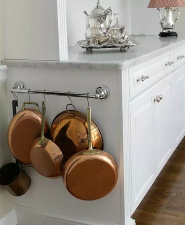 ▼在櫥櫃邊裝窗簾桿,用來掛鍋具很方便。
