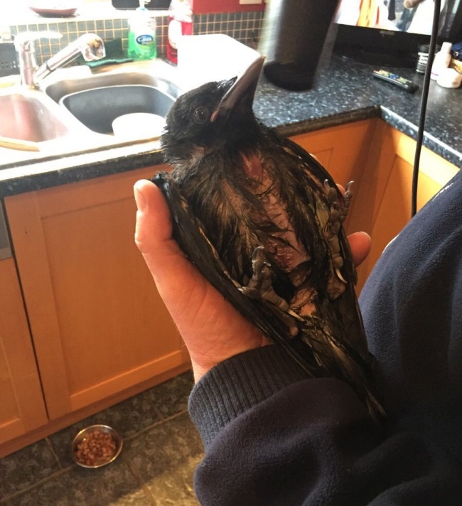 ▼用吹風機幫淋濕的烏鴉吹乾。