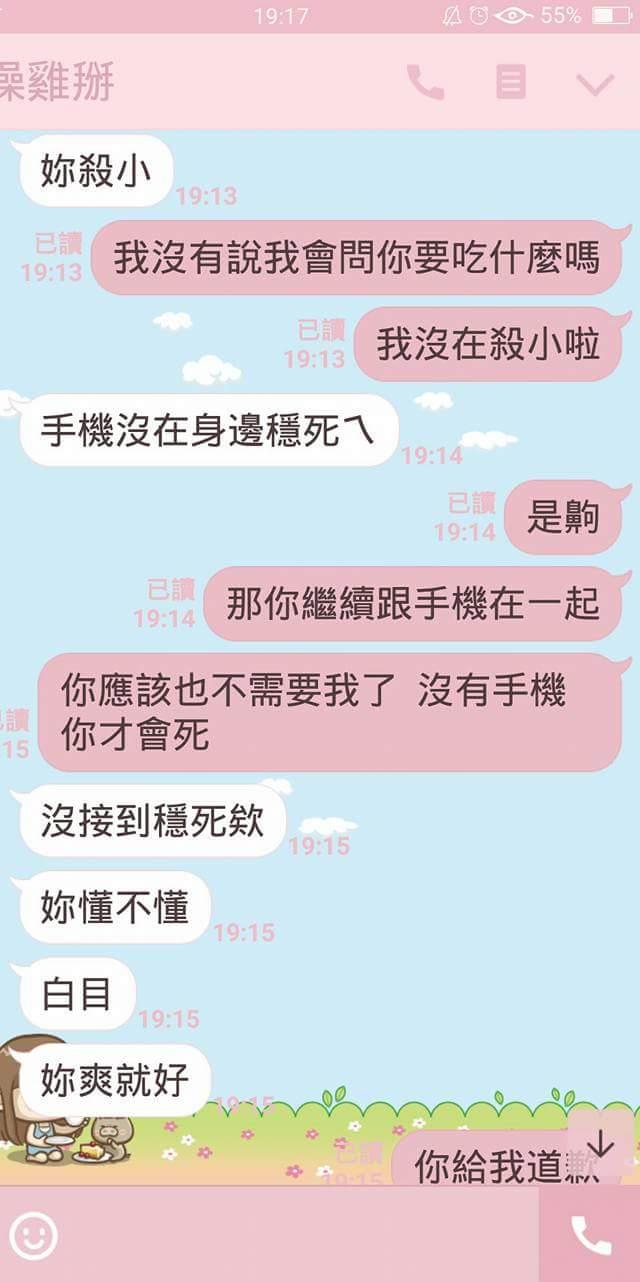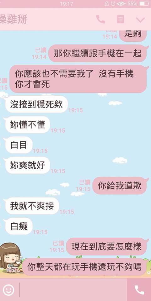 ▼可以看到雖然女生非常不高興,可是男生也因為被打擾了興致而正在氣頭上,甚至最後還怒嗆自己就是因為不爽才不接,甚至罵女方是白癡。女網友在綜合網友的意見之後,也表示自己將會好好考慮兩人之後的路該怎麼走。