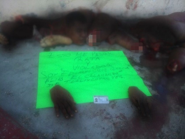 2017年12月21日前幾天,墨西哥維拉克魯斯州(Veracruz)的「La Víbora」小鎮發生了一起殘酷的謀殺案。被害者是一名21歲男子,他被殺死後屍體遭肢解,屍塊被丟在了教堂的門口。不僅如此,屍塊上還擺著一塊綠色的紙板,上面寫著「性侵犯、偷竊慣犯」等字樣。