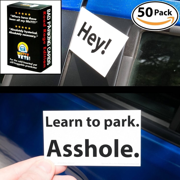 ▼憤怒卡片:看到有人亂停車,可以給他這張卡片:「去學學怎麼停車吧,蠢貨!」價格:16.99美元(約新台幣509.21元)。