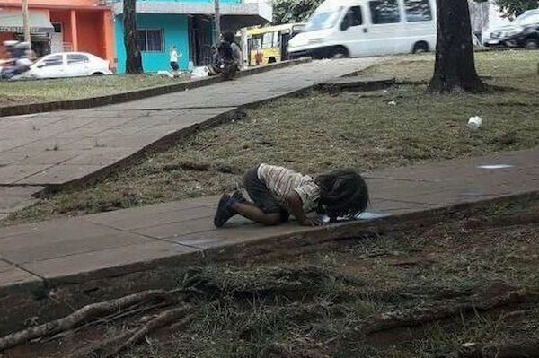 ▼在阿根廷的波薩達斯(Posadas),一位當地記者拍下了一張令人心痛的照片:一名年約3、4歲的女孩因為不堪37度熱浪的侵襲,渴到趴在地上舔水窪裡的髒水喝。這在我們的社會裡是絕對看不到的畫面。