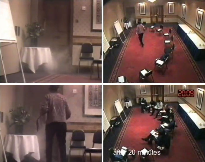 ▼室內煙霧實驗 (Smoke Filled Room Experiment):一群人分別被邀請進入房間填寫問卷,期間門縫中冒出很多煙霧。75%的人立刻通報情況,從冒出煙霧到通報,他們平均花了2分鐘時間;剩下的人無視煙霧,繼續填寫問卷,他們以為這是實驗的一部分。