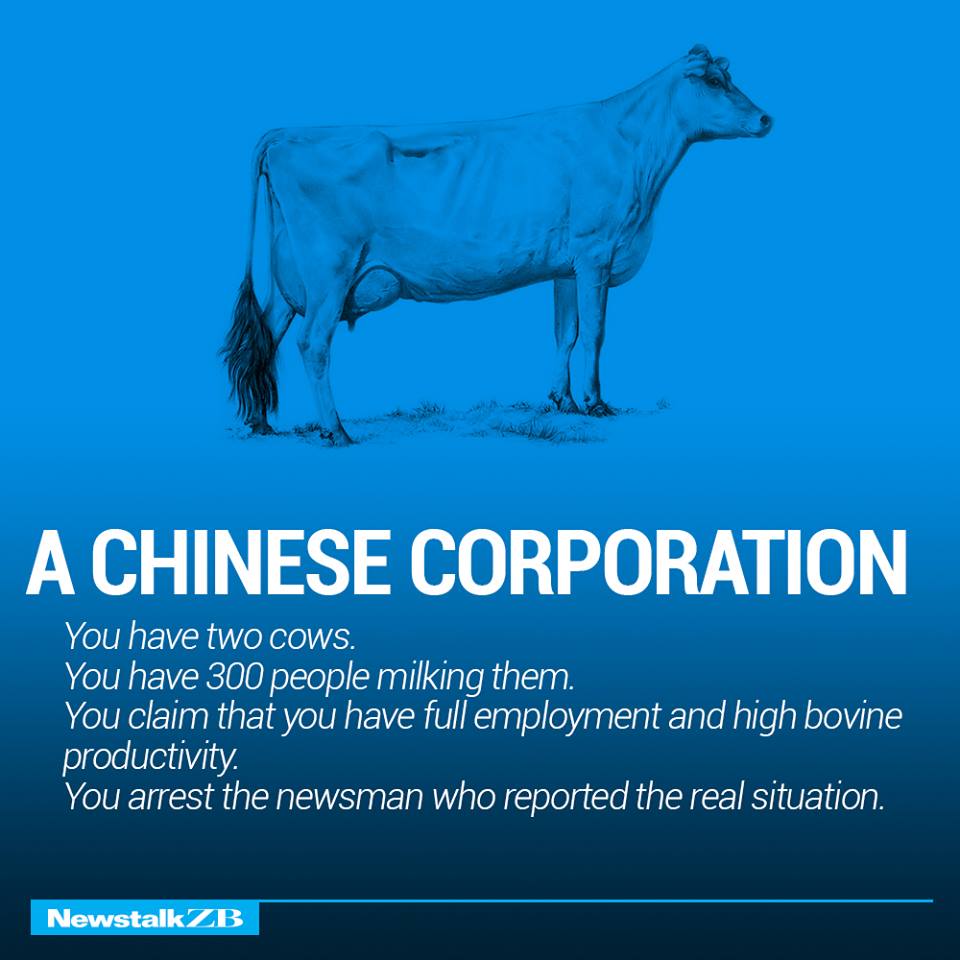 ▼12. 中國企業:你有兩頭牛,你僱用300個人擠牛奶,對外宣稱每個人都充分就業,且具有高產量。你把報導真相記者抓去關了。