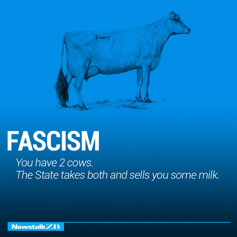 ▼3. 法西斯主義:你有兩頭牛,國家把兩頭都拿走了,然後賣牛奶給你。