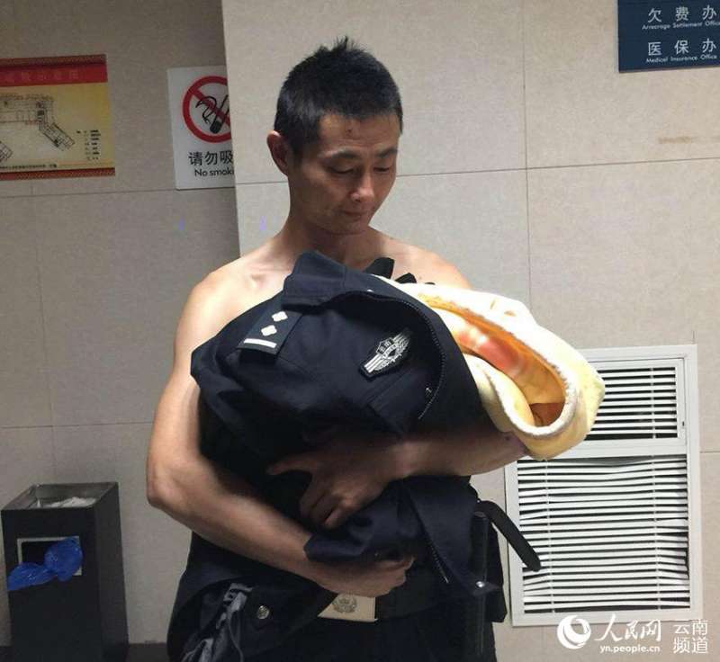 ▼他打赤膊抱著嬰兒,和同事一起來到了醫院。醫生給小嬰兒檢查後,表示他除了飢餓和體溫過低外,沒有其他生理缺陷和外傷。現在小嬰兒孩子在醫院的溫箱接受治療,警方已經開展救援程序,正在尋找他的父母。