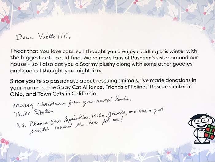 ▼比爾蓋茲已經連續參加這一活動好幾年了,VietteLLC也知道,但她從沒想過自己能收到對方送的禮物。箱子裡還有一個十字繡,上面繡著比爾蓋茲與她的形象,還有她家裡的4隻貓咪。