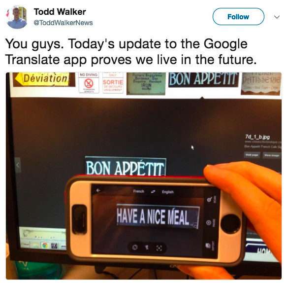 ▼Google翻譯App,對著拍照就能翻譯出來。