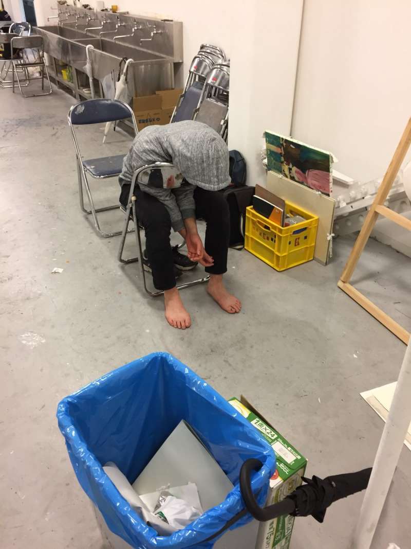 ▼原來他們為了準備東京造形大學的藝術CS季,全系的同學都忙得沒日沒夜的,疲勞的他們只要在地上墊一個書包就能夠睡得不省人事。