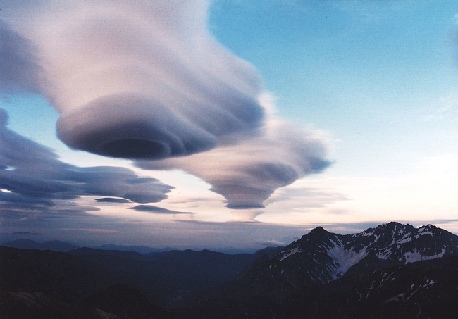 莢狀雲,外形像飛碟,所以常被認為是不明飛行物,其實是濕潤的空氣經過高山或者建築物,被抬升至大氣上方,當溫度下降的時候,空氣中的水分就會凝結成莢狀雲。