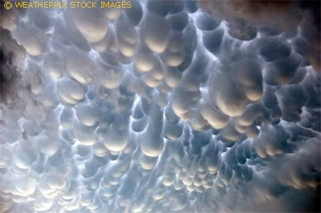 乳狀雲像一朵朵泡泡,雖然看起來很美,但是卻預示著會有極端的天氣出現。在積雨雲的下方形成,當下降氣流中溫度較冷的空氣與上升氣流中溫度較暖的空氣相遇時,便會形成如氣泡形狀的雲,可以綿延數百公里。在拉丁文中Mammatus的意思是「乳房」,你可以想像一下天空中飄滿了「乳房」的畫面。