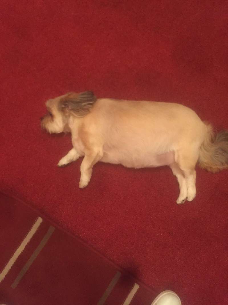 ▼一家人找了好久,沒有看到火雞的蹤影,只看到5歲狗狗Bubba「腫」了好幾圈,懶洋洋躺在地上爬不起來。大家這才意識到,牠偷偷吃掉了整隻火雞,撐得無法動彈。