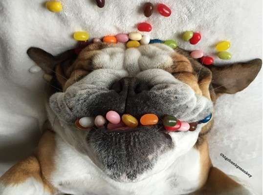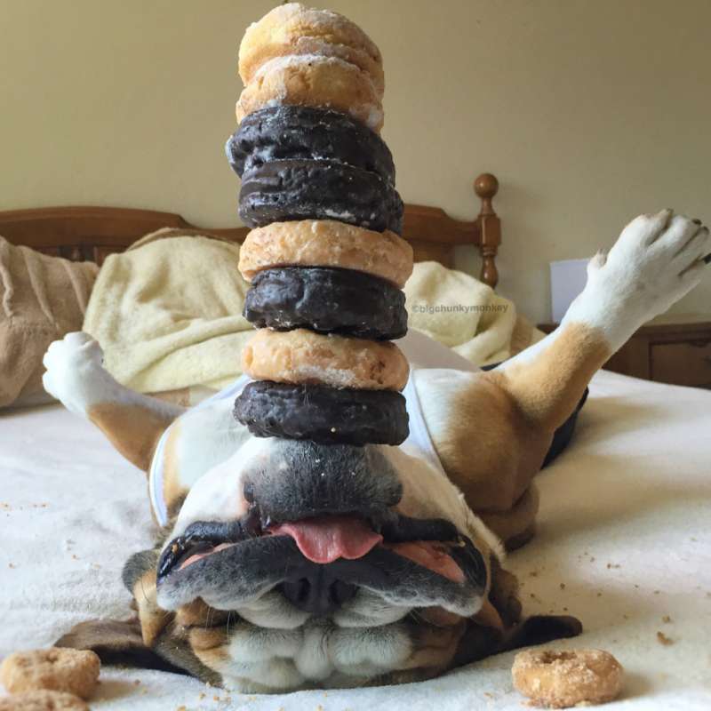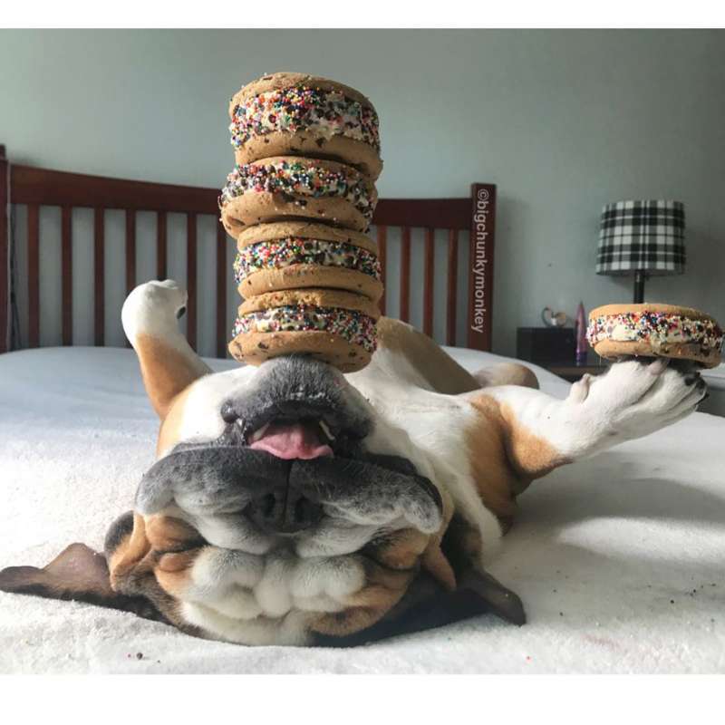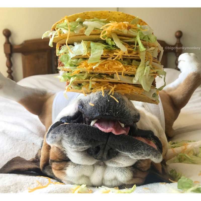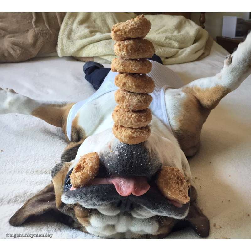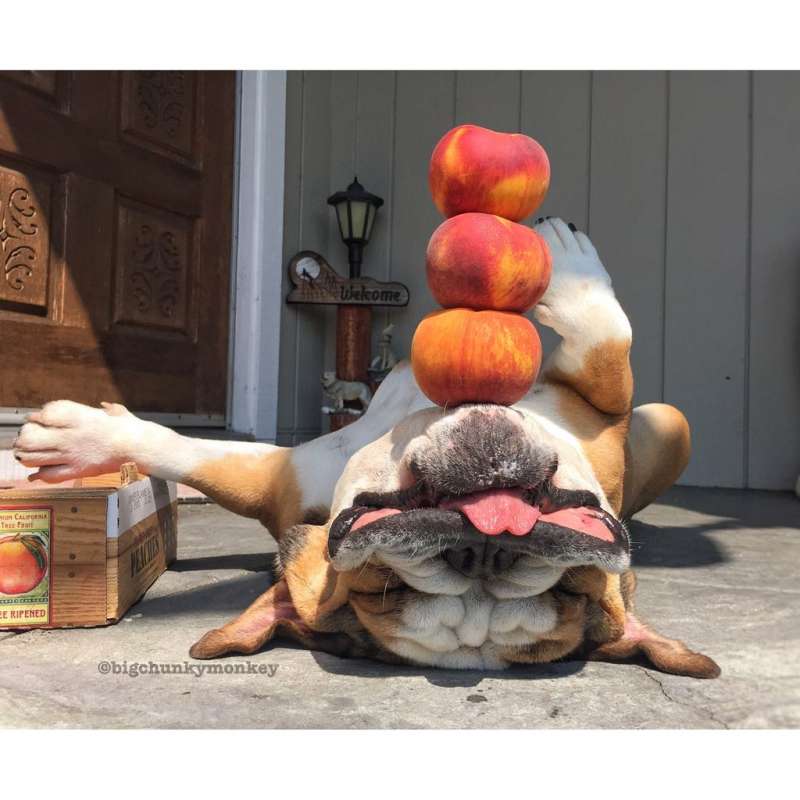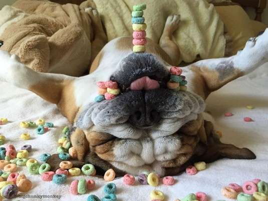主人發現鬥牛犬睡死就不會動 於是在下巴惡作劇「食物疊疊樂」玩到上癮