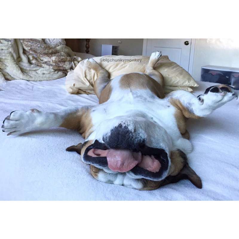 一般來說,狗狗就算睡著也很警惕,但下面這隻叫做Monkey的鬥牛犬卻不一樣。牠喜歡仰躺著睡,而且每次睡著都像昏迷過去一樣,不醒人事。