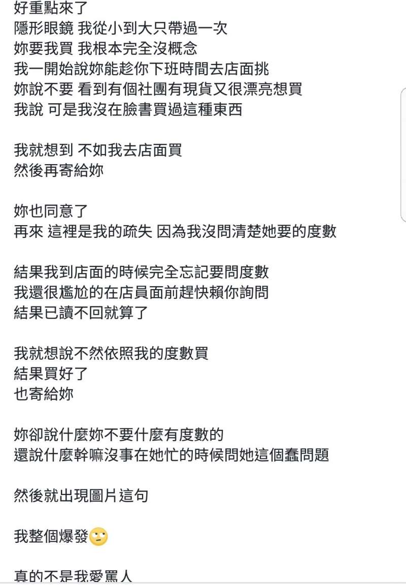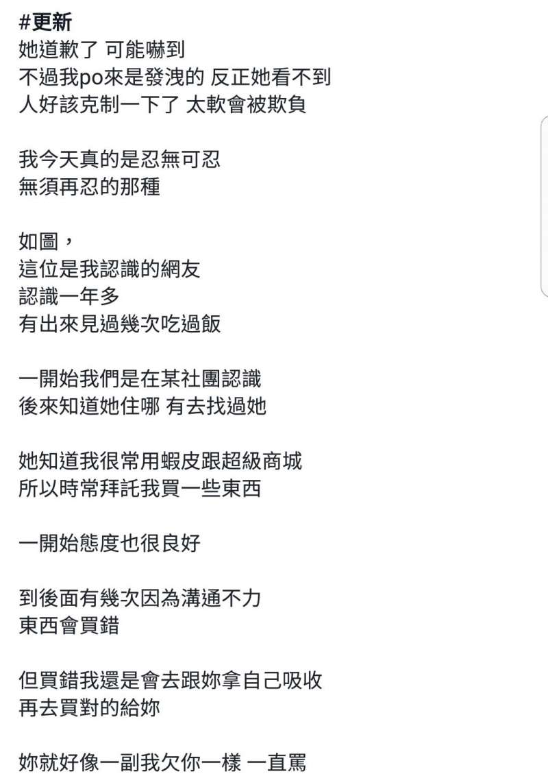 2017年12月29日近日有一位女網友在臉書《爆怨公社》上發文,表示有個朋友總是要求她幫忙在網路上買東西,剛開始時態度還很好,可是之後的態度也越來越差,最後當她買錯時還直接罵她「白癡」,讓她忍不住爆氣,在4分鐘內連回15句話反嗆,讓對方嚇得趕緊道歉。