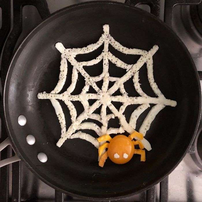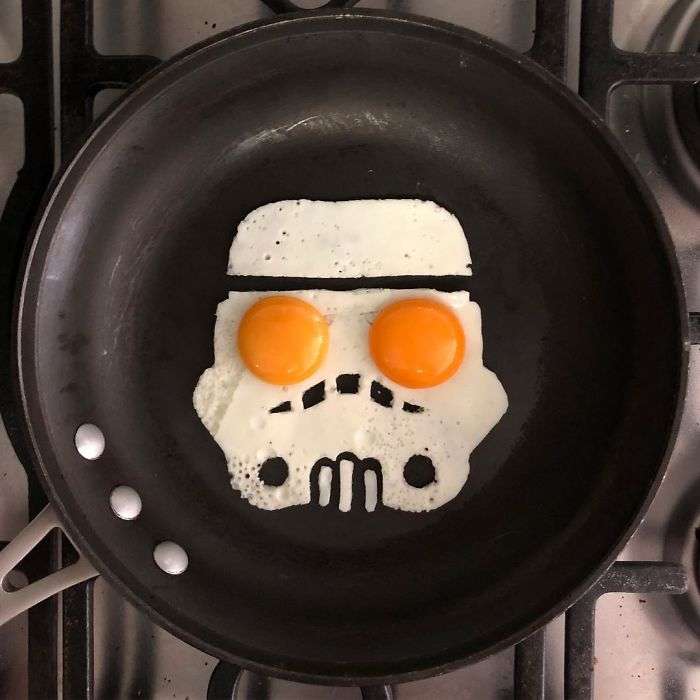 ▼他配合使用餐刀,把煎蛋變成了豐富的模樣。除了在煎蛋中加入流行文化元素,他還打造了梵谷的名作。