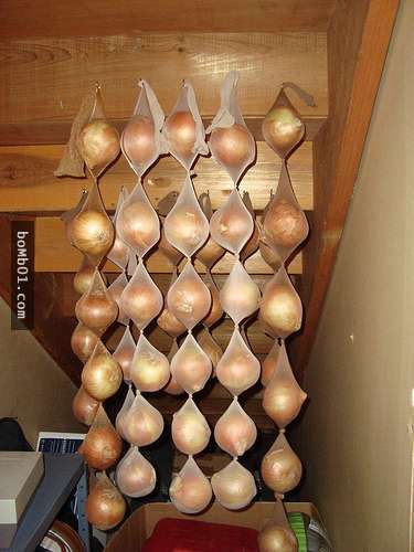 把洋蔥放在絲襪中,在兩個洋蔥之間打上結,掛在牆上是絕佳的藝術裝飾品。