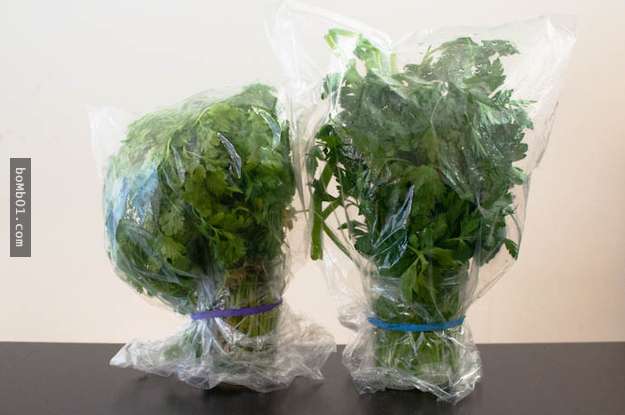 切徑、放入水中,在頂部罩上塑膠袋,冷藏。將保鮮一周或更長時間,同樣你也可以用這種方法來保鮮香菜和歐芹。