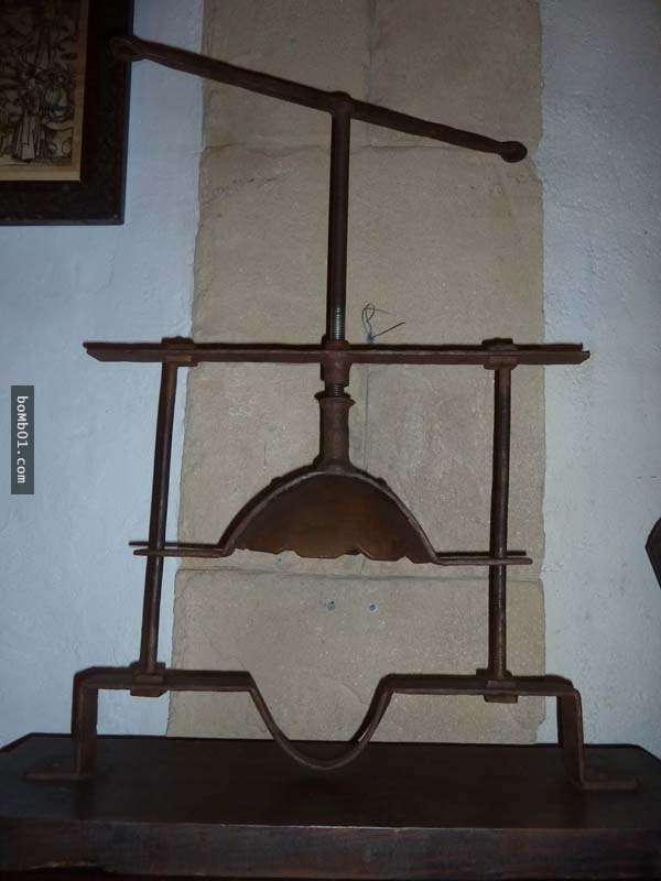 ▼10.碎頭機:這個裝置在中世紀被廣泛使用。人的下巴被放在底杆上,頭放在帽子底下。轉動把手,帽子會被緩慢的壓到底杆上,直到頭被壓碎。