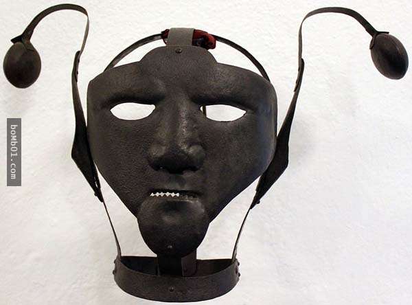▼4.罵人者所受的韁繩刑罰:主要用於女性,這個鐵質面罩有些地方覆蓋著長釘。這樣如果罪犯試圖說話,他就會感受到劇痛。