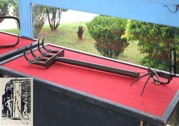 ▼19.異教徒叉:這個裝置是兩端有叉子的金屬杆,一個叉子放在下巴底下,另一個放在胸部上,頸圈支撐著叉子,使罪犯頭部直立,如果不這樣做他們就會感到疼痛。