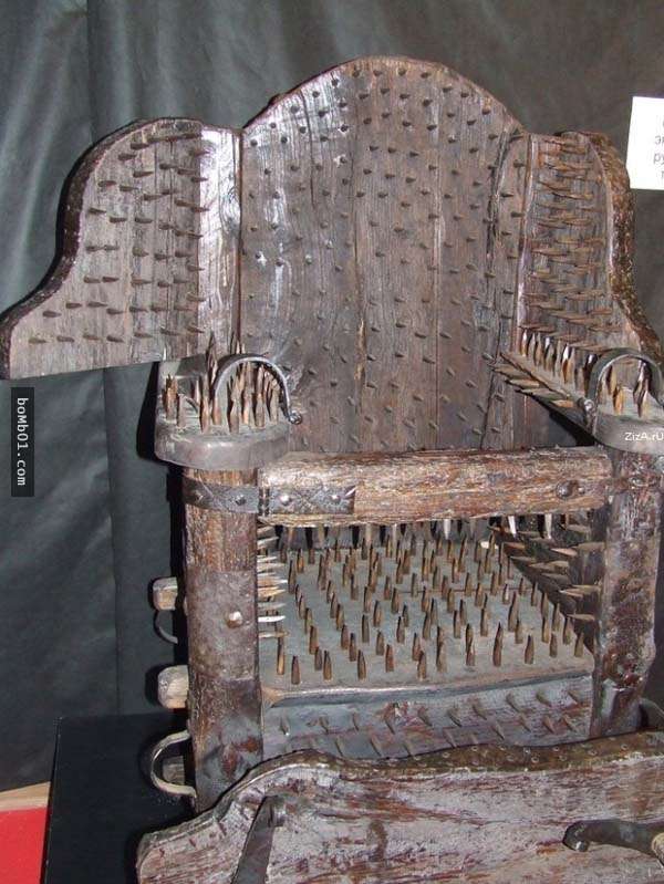 ▼6.刑椅:這種椅子有許多不同的形式,但他們一樣的是整把椅子都被釘子覆蓋,包括靠背,放手臂和腿的地方,還有座位。為了防止罪犯移動,他們會被綁在這個裝置上。