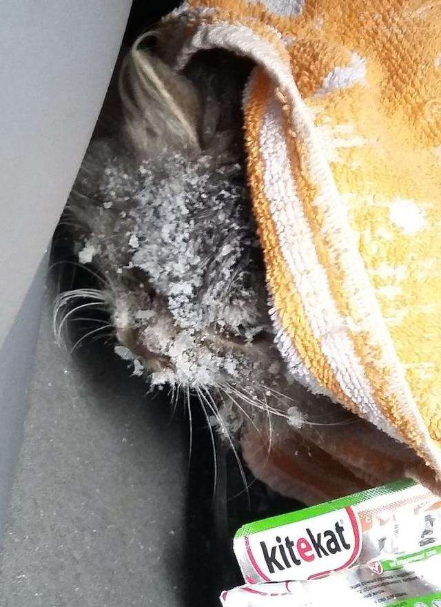 ▼Slava 決定伸出援手,找了一條毛巾將牠抱了起來,帶到車上打開暖氣,貓身上的冰雪才漸漸融化。