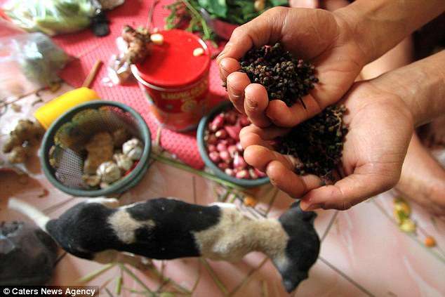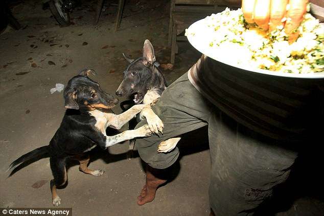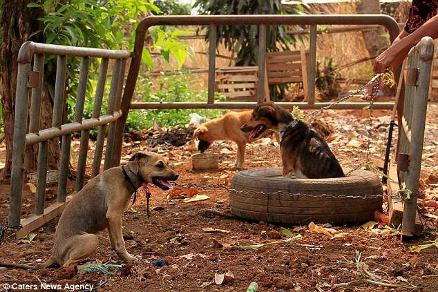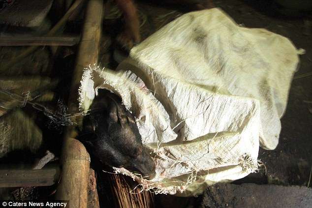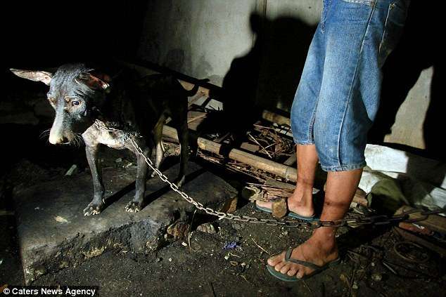 ▼剛被送來的狗狗大多很瘦小,工人就把牠們栓在一個單獨的房間,餵牠們吃大米、蔬菜,等牠們長胖再殺死。