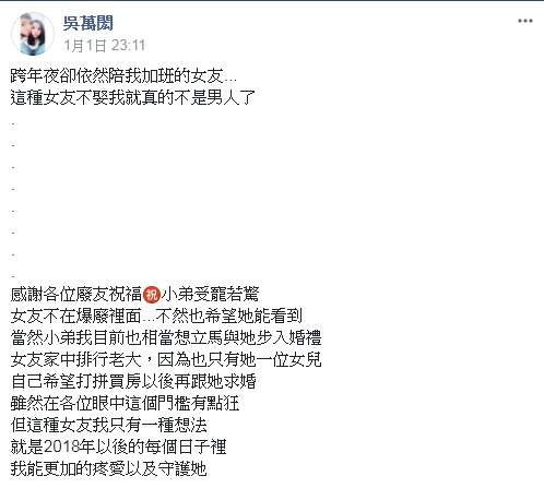 2018年01月03日和愛的人一起跨年,是一件很幸福的事。前幾天,一名男網友在臉書社團「爆廢公社」PO文說:「跨年夜卻依然陪我加班的女友,這種女友不娶我就真的不是男人了。」