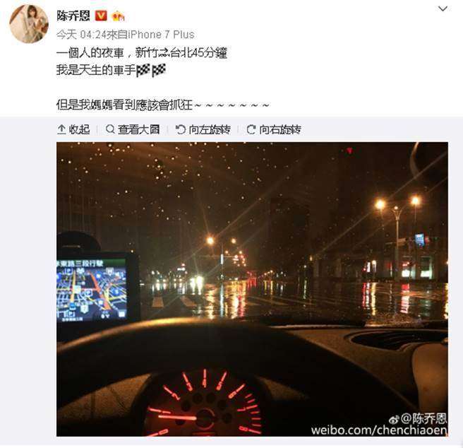 ▼陳喬恩在圈內出名開車快又狠,曾經在去年年節時在微博分享自己從新竹開到台北只要45分鐘。