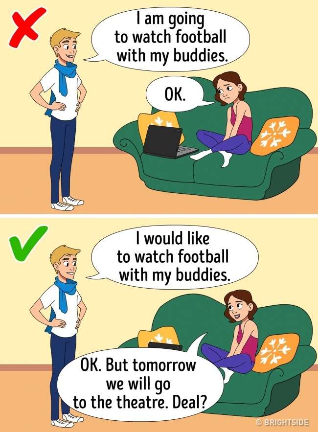 對:「我想和兄弟去看球賽。」「好啊,但明天我們一起去看電影,好嗎?」