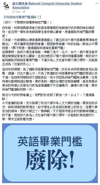 ▼政大學生會很快也在臉書專頁貼出了這項好消息,宣佈「政大,不需要英語畢業檢定門檻。」讓許多政大學生的紛紛留言讃好。