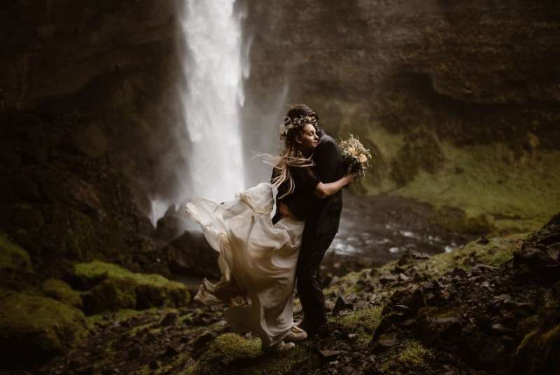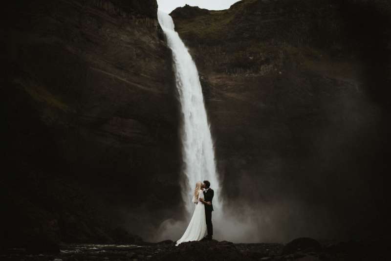 ▼轟然滑落的瀑布底下,新郎在新娘的唇上烙上誓言之吻。
