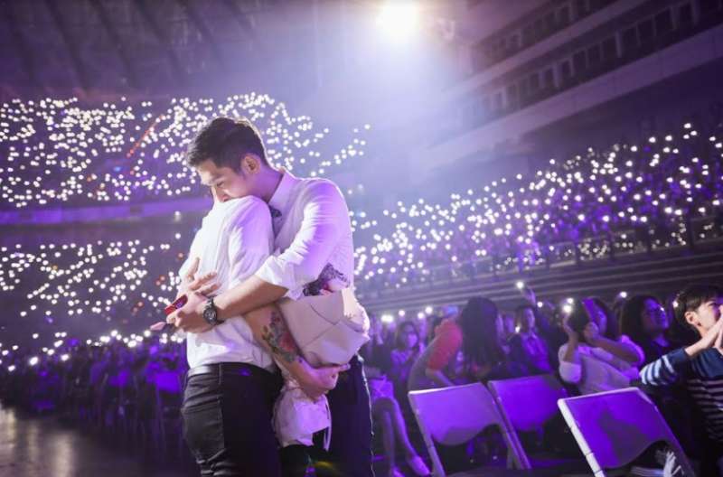 ▼說完後,他手持婚戒單膝下跪,旁邊的男友又驚又喜,觀眾們也紛紛開起手機燈,讓小巨蛋充滿點點星光,場面很溫馨。在這樣浪漫的氣氛下,男友感動點頭:「我願意。」兩人隨後緊緊擁抱,忍不住落淚。蔡健雅繼續唱《說到愛》,又邀全場合唱《Beautiful Love》,讓那對戀人覺得很幸福。
