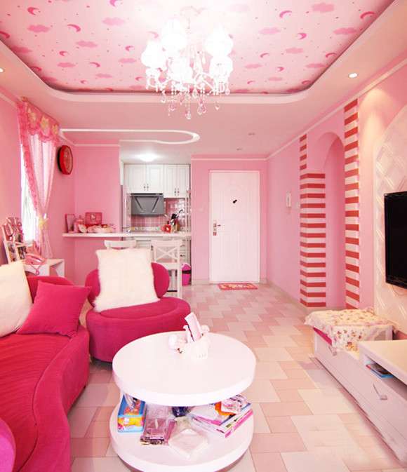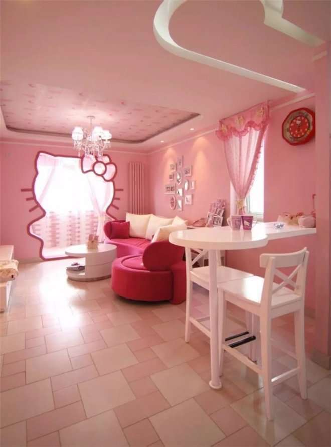 雖然出差回家的老公有些不適應滿眼的粉紅色,但為了讓妻子開心也認了!你是不是也超愛這樣的Hello Kitty主題公寓?