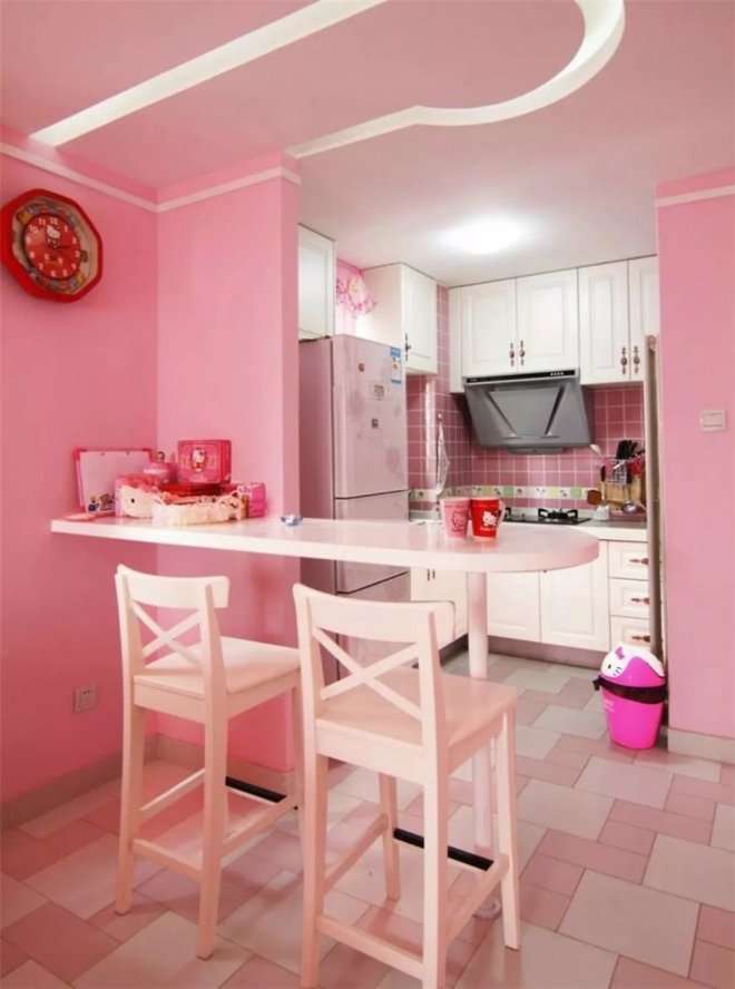 ▼廚房裡的粉色方磚和粉色紗簾,每一處小細節都足以顯示自己對Hello Kitty的喜愛。