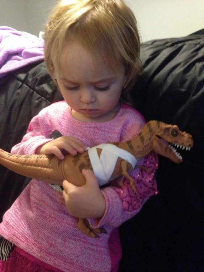 ▼2歲小女孩說恐龍受傷了,請媽媽幫忙治療。