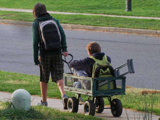 ▼朋友腳受傷了,他就用小車拉他上學、放學。