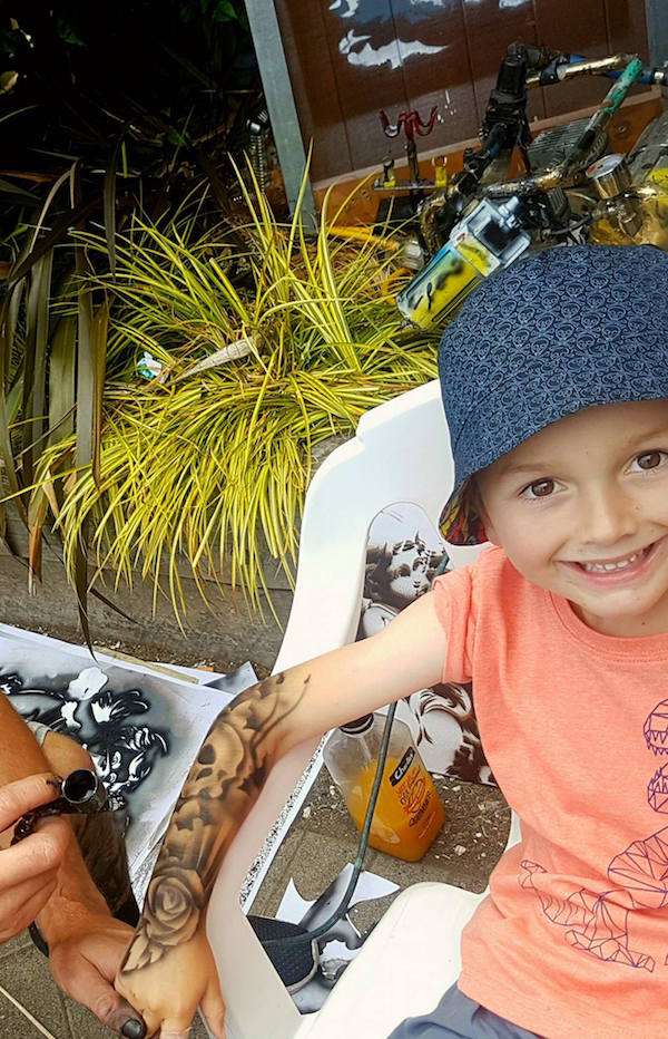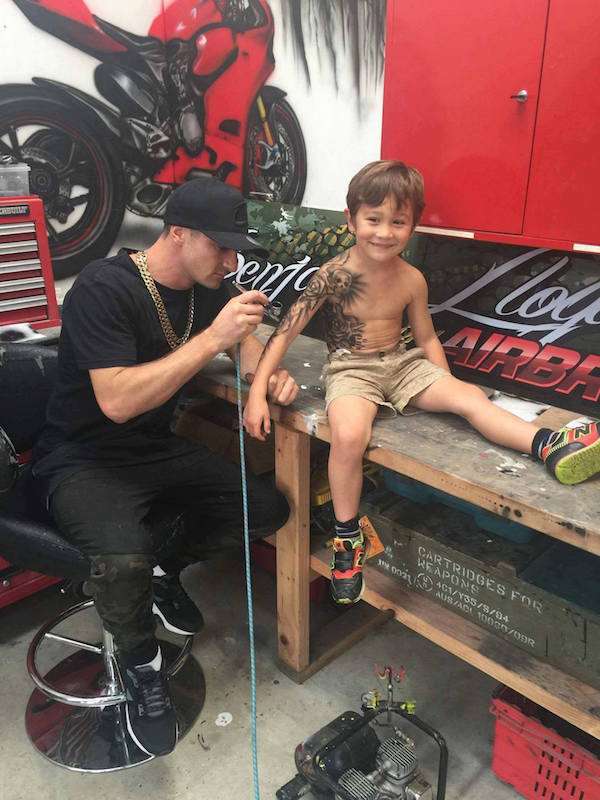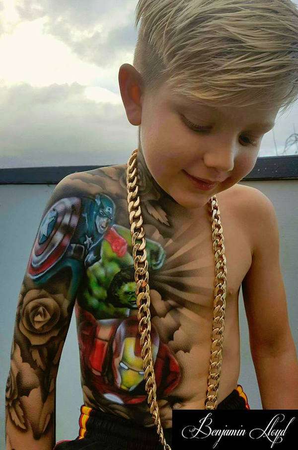 ▼班傑明(Benjamin Lloyd)經常利用閒暇之餘幫小孩刺青,這畫面看起來有點駭人,不過仔細觀察後,就可以發現他其實是拿噴槍彩繪。