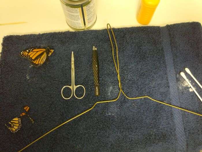 ▼她所使用的手術工具有:剪刀、毛巾、鉗子、鋼絲衣架、棉花棒、滑石粉、另一隻死掉的帝王蝶的翅膀。