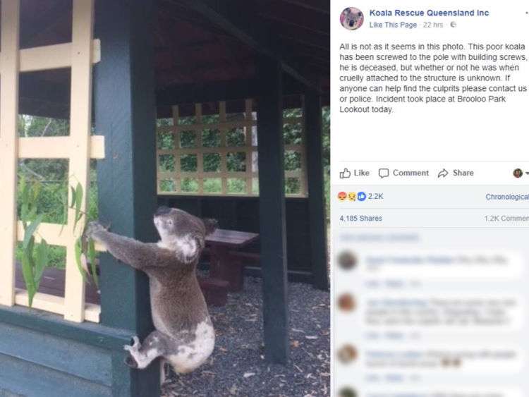 2018年01月12日本月11日,澳洲昆士蘭省無尾熊拯救組織(KRQ)在臉書PO出了一張照片中。照片中的無尾熊抱著柱子,閉著眼睛,好像睡著了一樣。但仔細看看就會發現,牠的雙手被人用釘子釘在柱子上,已經死去了。