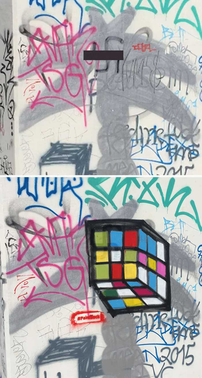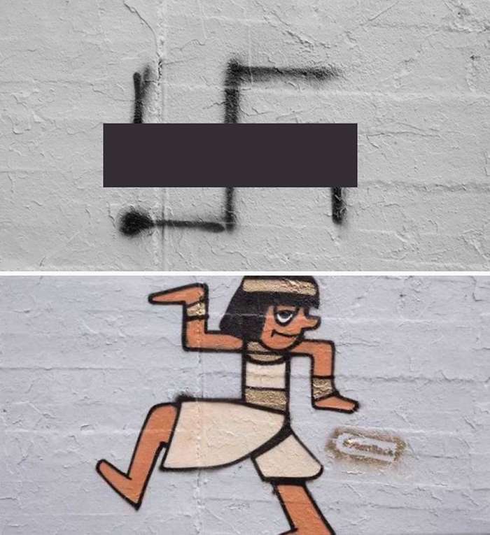 ▼他和很多藝術家合作,發起了改造塗鴉活動「Paintback」。他們沒有把那些「卍」字符塗白,而是加上線條和色彩,讓充滿仇恨的符號變得愛意滿滿。