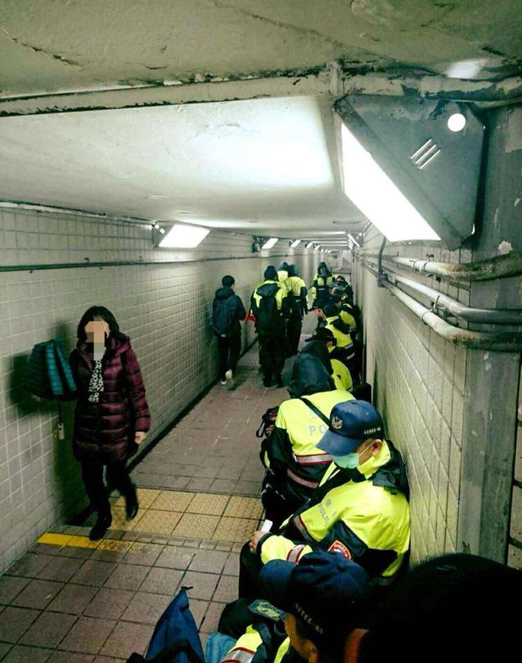 2018年01月13日天氣嚴寒,但還是有很多人得待在戶外工作。台灣警察權益平等協會副理事長高振修就貼出一張照片,畫面顯示警察為了來維持抗議人潮的秩序,得在冷天裡穿雨衣睡地下道,令無數網友不捨。