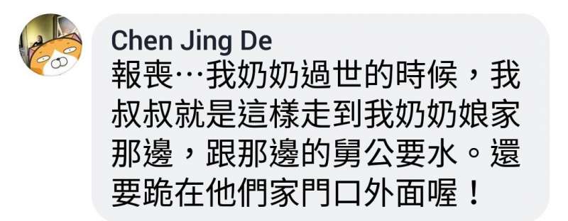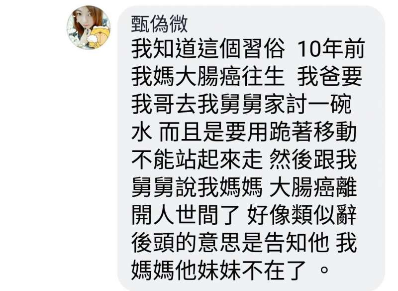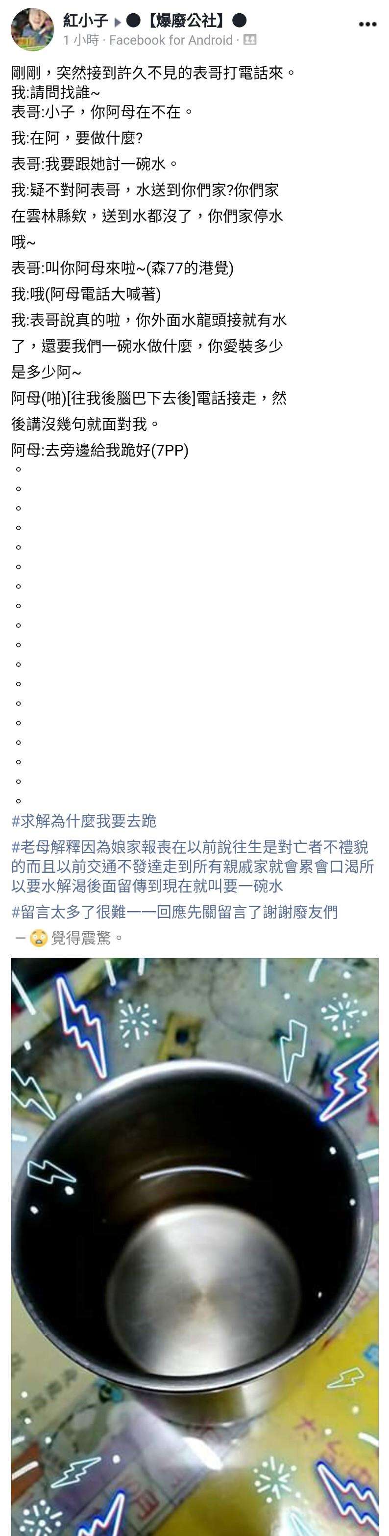 ▼這時網友的媽媽搶走了電話,還往他的頭「巴下去」,大聲說道:「去旁邊跪好!」讓網友一頭霧水。事後聽媽媽解釋才知道,原來「一碗水」背後有著報喪的意思,「娘家報喪在以前說往生是對亡者不禮貌的,而且以前交通不發達,走到所有親戚家就會累會口渴,所以要水解渴,後面留傳到現在就叫要一碗水。」