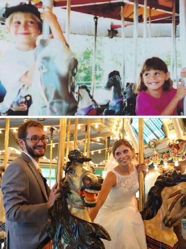 ▼這兩名小孩在玩旋轉木馬時就已經喜歡上對方,可是高中時才在一起,如今他們終於結婚了。