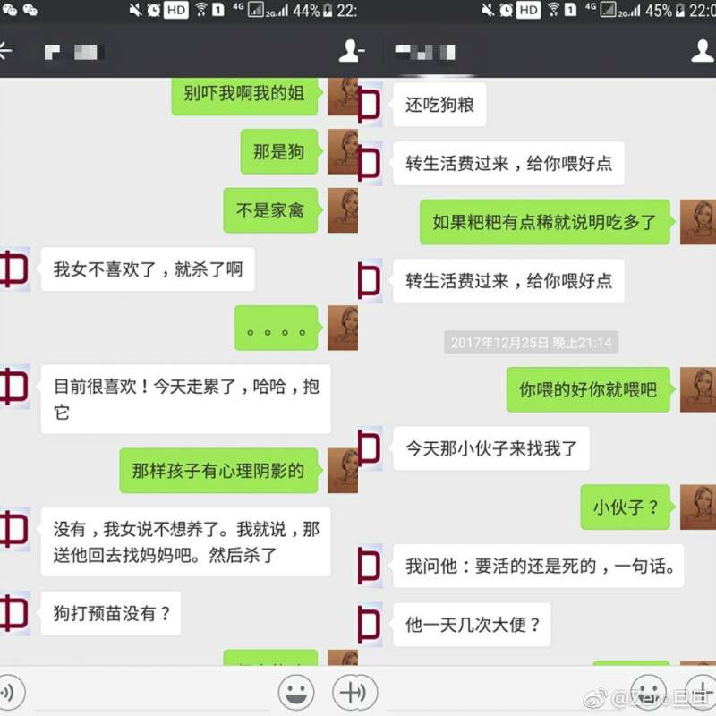 ▼「Zero旦旦」非常疼愛自己的狗狗,多次懇求賀莉把狗狗還回來。賀莉多次刁難還發微信威脅表示「賣狗肉店了」、「轉錢過來給你喂好點」、「我女兒不喜歡就把牠殺了」、「不給錢把牠冷死」。