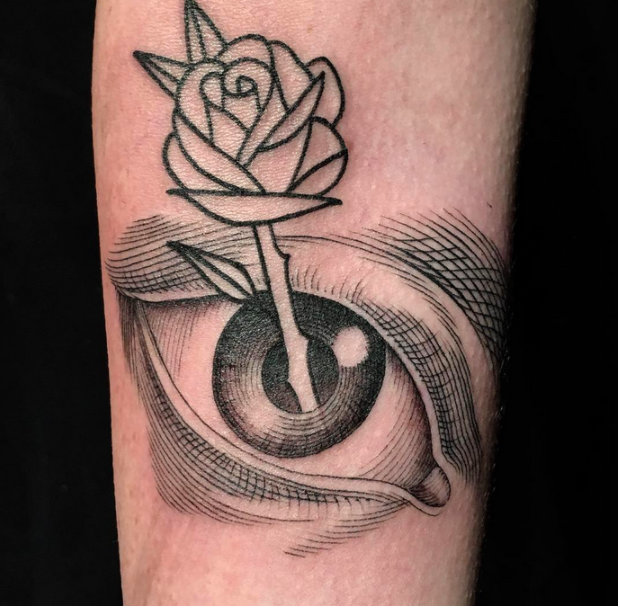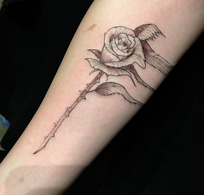 ▼手臂上長出一朵帶刺的玫瑰花,葉片紋路也都精細地描繪在上面。