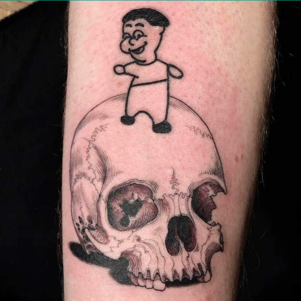 ▼嚇人的骷顱頭上站著逗趣的漫畫人物,帶有一點衝突的美感。