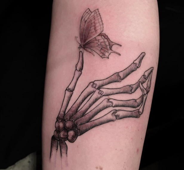 ▼飛翔的蝴蝶停在死神的手上,似乎有什麼神秘的含義…